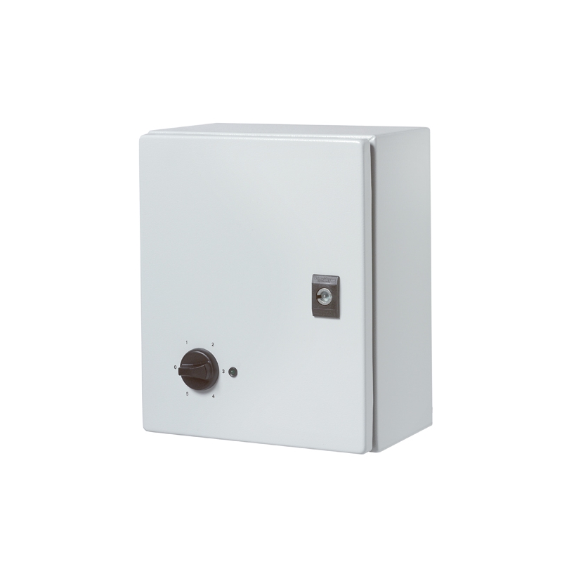 Dieser Regler ist geeignet für spannungsgesteuerte 3-Phasen-Motoren und kann manuell mit einem Schalter (Stellung 0 bis 5) am Gehäuse bedient werden.